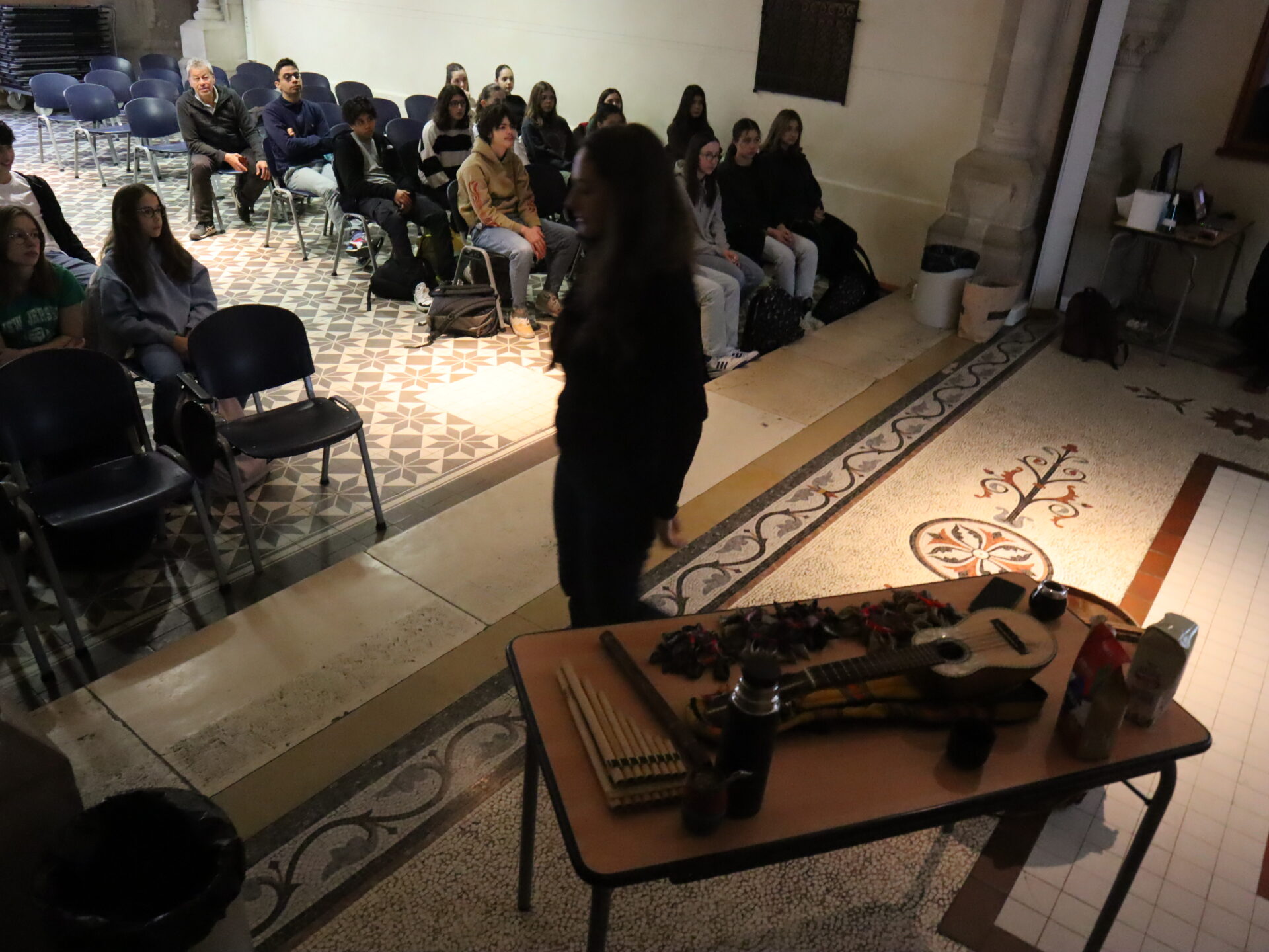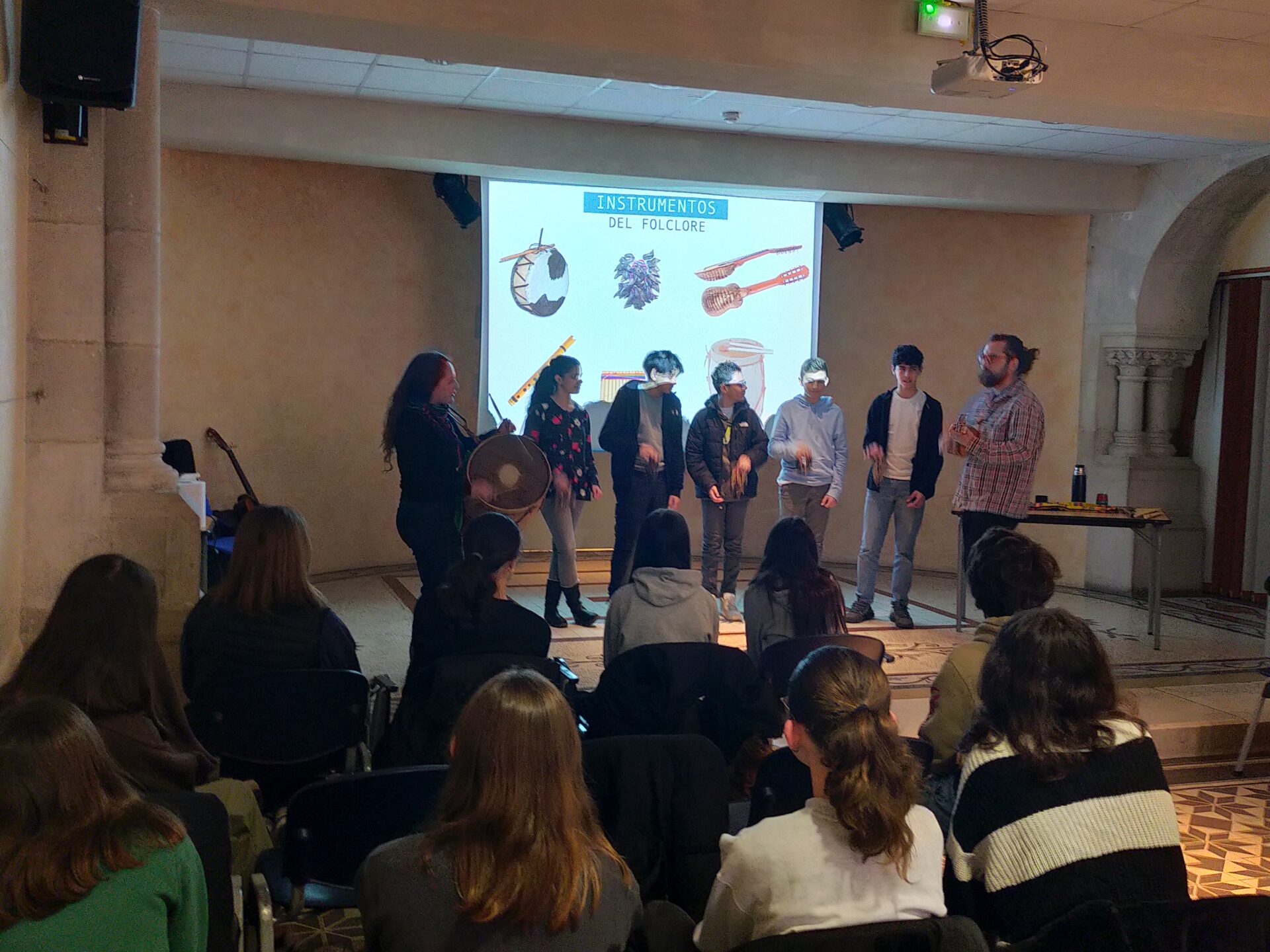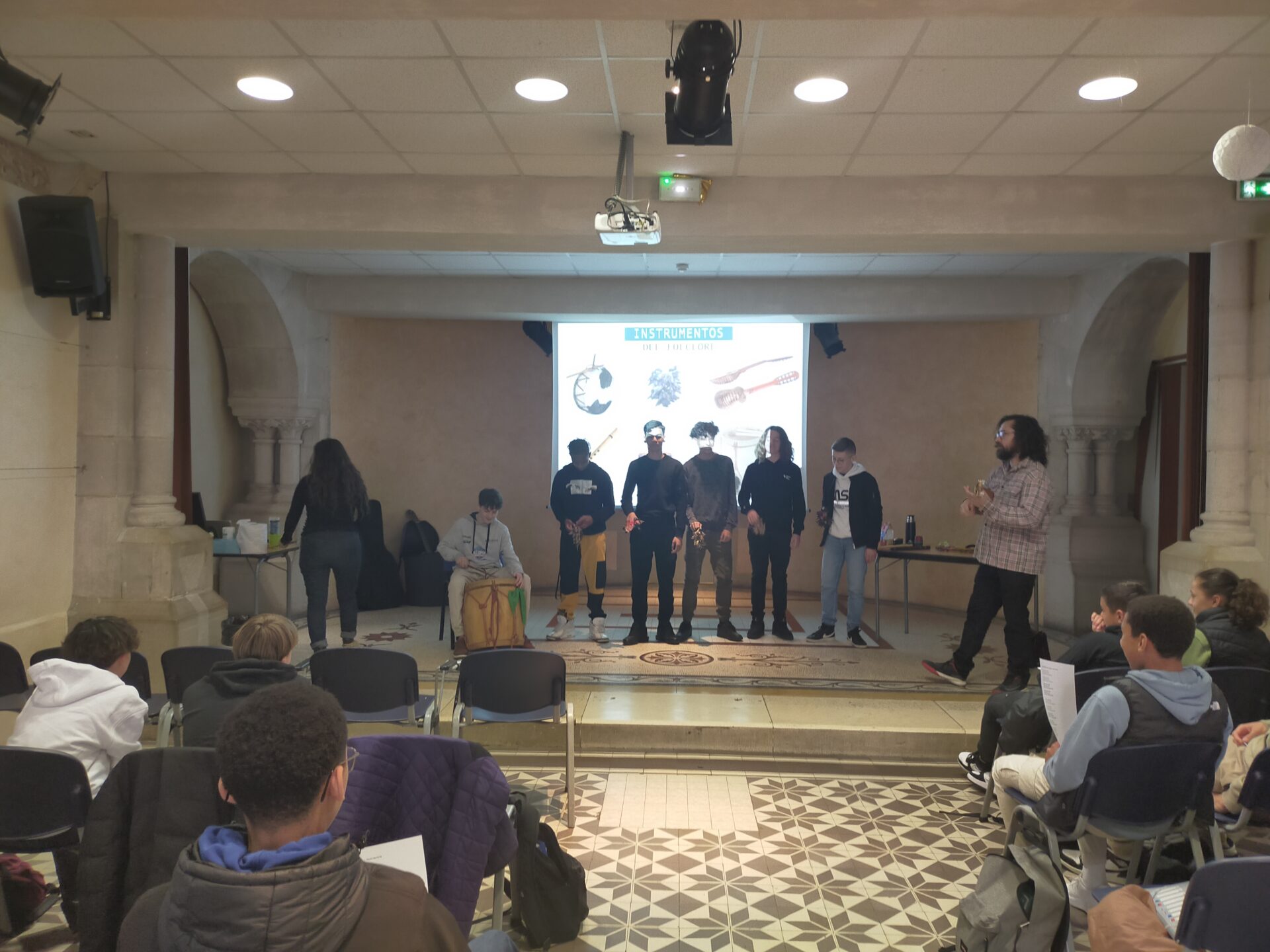 Jeudi 23 mars, les élèves hispanistes de quelques classes de quatrième ont pu échanger avec un duo de musiciens argentins à propos de la culture argentine, notamment son folklore. La finale de la dernière coupe du monde de football a évidemment été évoquée dans la discussion, menée entièrement en espagnol.