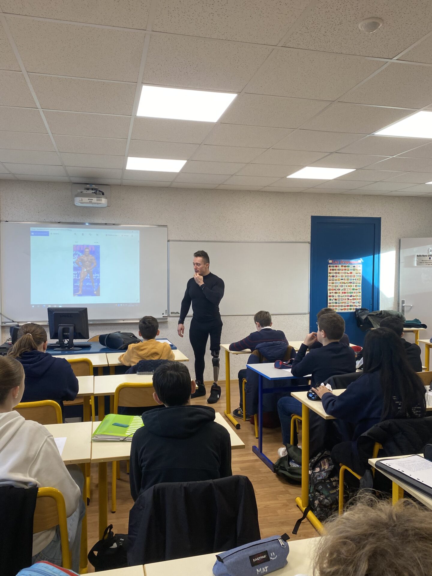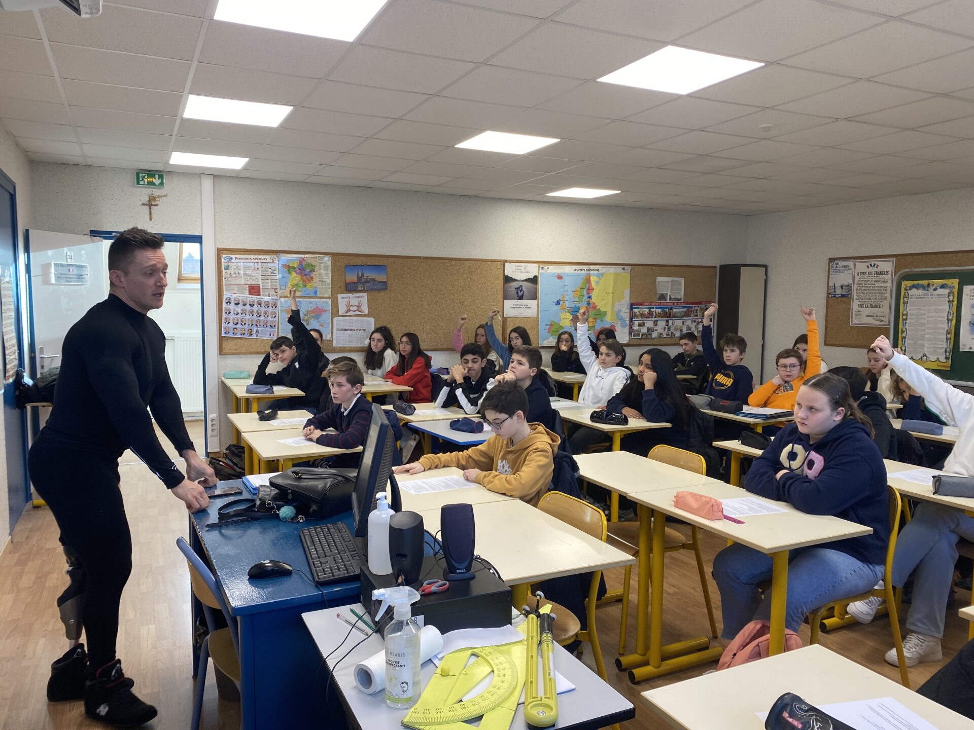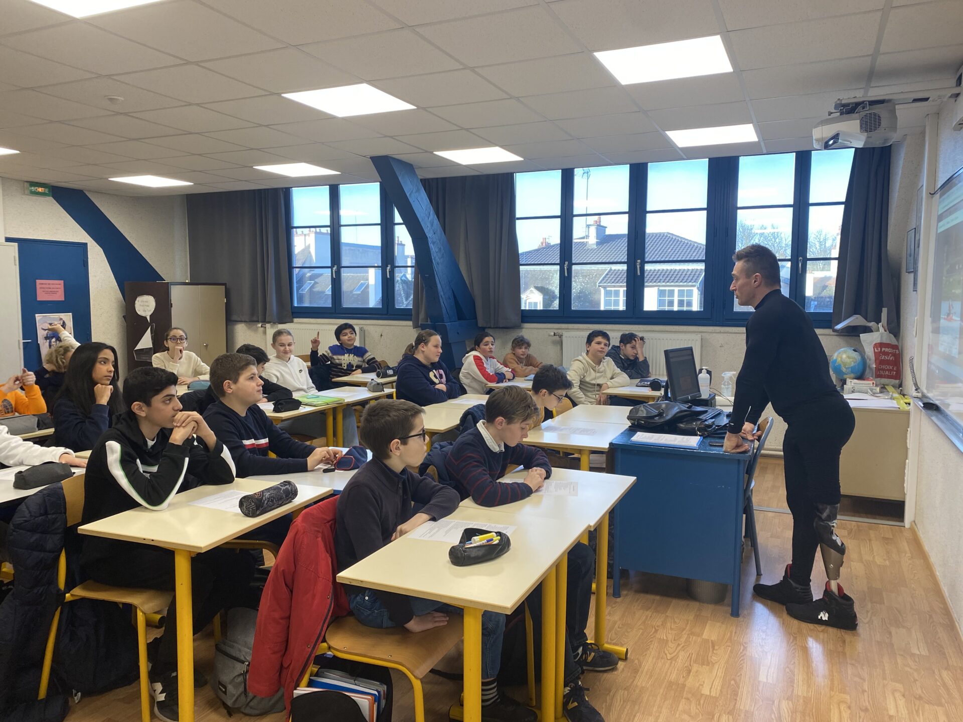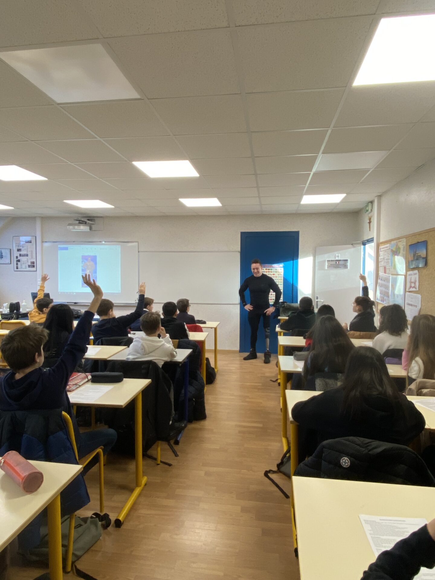 Julien CAMDESSOUCENS, champion du monde de bodybuilding handisport, mais aussi champion de France d’haltérophilie et de pirogue de course en ligne, est intervenu devant la classe de 5ème A, dans le cadre du cours d’EMC sur le handicap et les discriminations. Julien est un athlète de haut niveau, amputé d’une jambe depuis l’enfance. Les élèves ont pu lui poser des questions sur son handicap et échanger avec lui sur son quotidien de sportif et sur les différentes discriminations qu’il a pu rencontrer.